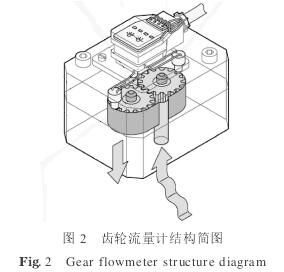 齒輪流量計(jì)屬于容積式流量計(jì).齒輪流量計(jì)結(jié)構(gòu)簡(jiǎn)圖見(jiàn)圖2.其工作原理為:流體在上游的壓力作用下進(jìn)入流量計(jì),推動(dòng)一對(duì)嚙合的圓柱齒輪轉(zhuǎn)動(dòng).齒輪的齒頂圓和端面與殼體底座及殼體上蓋之間的間隙非常小,齒輪在轉(zhuǎn)動(dòng)過(guò)程中,輪齒把流動(dòng)的液體連續(xù)不斷地分割成單個(gè)的體積單元,每個(gè)體積單元等于兩個(gè)輪齒的容積.齒輪每轉(zhuǎn)動(dòng)一個(gè)齒距的角度,排出等于兩個(gè)輪齒容積的流體體積.在殼體上蓋對(duì)應(yīng)測(cè)量齒輪分度圓處安裝兩個(gè)電磁轉(zhuǎn)速傳感器,齒輪轉(zhuǎn)動(dòng)時(shí),輪齒每次經(jīng)過(guò)電磁轉(zhuǎn)速傳感器,流量計(jì)發(fā)出一個(gè)電脈沖信號(hào).根據(jù)流量計(jì)發(fā)出的脈沖數(shù)可以測(cè)量流體的流量。