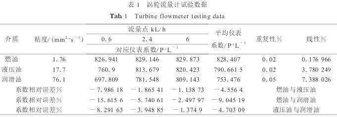 本文選取了常用國(guó)產(chǎn)渦輪LWGY-15與德國(guó)KRACHT公司VC5齒輪流量計(jì)為樣本,分別在燃油、液壓油、潤(rùn)滑油流量裝置上進(jìn)行了實(shí)驗(yàn).實(shí)驗(yàn)數(shù)據(jù)如表1、表2所示.