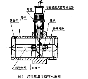 ①法蘭夾裝式液體渦輪流量計:渦輪流量計是一種流量測量儀表,流動流體的動力驅(qū)使渦輪葉片旋轉(zhuǎn),其旋轉(zhuǎn)速度與體積流量近似成比例(線性關(guān)系)。信號輸出方式包括脈沖、模擬量或數(shù)字通信方式。結(jié)構(gòu)原理見圖1。
