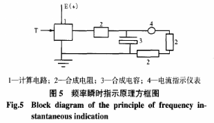 經(jīng)過整形后的輸入頻率(脈沖)作用于計算電路的輸入端T,使電路中交替出現(xiàn)截止或?qū)▋煞N狀態(tài),放大器輸出端脈沖波形被整形,與T的波形相反,當(dāng)放大電路出現(xiàn)截止?fàn)顟B(tài)時,電源E通過外圍電路(或集成內(nèi)部)在儲能電容C中預(yù)存電荷;當(dāng)放大電路出現(xiàn)導(dǎo)通狀態(tài)時,C預(yù)存的電荷通過外圍電路(或集成內(nèi)部)迅速釋放。就這樣輸入的頻率(脈沖)經(jīng)過電子電路改變?yōu)榕c之相對應(yīng)的電流信號。電路里的電流指示儀表4即刻顯示該計量電流值I的多少,I=q/T,而q=C·E,f=1/T(q為一個脈沖周期電容所充電荷量;C為電容量;E為電源電壓值;f為充放電頻率)。合并三式可得到公式(6):
