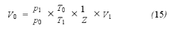 由式(14)可知,氣體的體積與壓力、溫度及壓縮系數(shù)均有關(guān),氣體渦輪流量計(jì)必須把工況下測(cè)得的體積數(shù)經(jīng)過壓力、溫度修正換算為標(biāo)準(zhǔn)狀態(tài)下的體積值。且當(dāng)氣體的溫度比較低,壓力比較高時(shí),必須考慮壓縮系數(shù)的影響,這樣才能保證高精度的氣體流量計(jì)量。換算公式為: