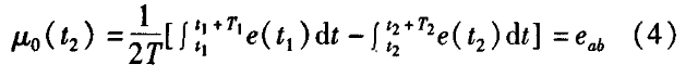 熱力管網(wǎng)供水流量計一般都采用工頻交流電源供電,其電源電壓的幅值和頻率的變化都會給熱力管網(wǎng)供水流量計帶來電源性干擾噪聲。對電源電壓的幅值變化,因采用多級集成穩(wěn)壓,一般而言電源電壓的幅值變化對電磁流量的測量精度影響不大。當(dāng)電源電壓的頻率波動時,雖然其波動范圍有限,但對熱力管網(wǎng)供水流量計測量精度影響較大。為了解決工頻干擾問題,實(shí)現(xiàn)對流體流速感應(yīng)電勢e柚信號的準(zhǔn)確測量,需利用以下基本關(guān)系:①勵磁周期為工頻周期的整數(shù)倍,即勵磁頻率為50/nHz(n為偶數(shù));②正負(fù)勵磁下的同相位采樣。圖2是對應(yīng)低頻矩形波勵磁形式下的典型電勢信號形式,按上述關(guān)系在一個勵磁周期下,若假設(shè)t。和t:點(diǎn)為工頻干擾的等效干擾點(diǎn),且采樣寬度T=T1=T2,則e –ab的基本算式為:,