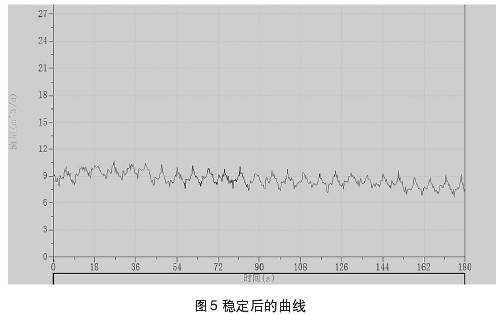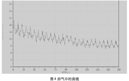 圖4、圖5中所示曲線為測(cè)量過(guò)程中所截取的集流傘中所聚集的氣相,通過(guò)排氣通道排出時(shí)與排出后的測(cè)量曲線。測(cè)試過(guò)程中錄取到的儀器排氣的過(guò)程,當(dāng)集流傘完全支開后仍需要開啟流量測(cè)試進(jìn)行實(shí)時(shí)檢測(cè),否則可能會(huì)錄取資料失真。
