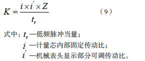 根據(jù)實際流量計的所測得儀表系數(shù)K 更換對應(yīng)齒輪傳動比,使機(jī)械表頭顯示部分和齒輪轉(zhuǎn)動發(fā)出低頻脈沖輸出均與高頻脈沖輸出匹配,實際三者關(guān)系如下: