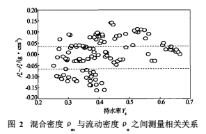 我們希望用測(cè)量的三相流混合密度ρm來表示流動(dòng)密度ρn,但是,這二者在實(shí)驗(yàn)測(cè)量關(guān)系上呈現(xiàn)復(fù)雜變化關(guān)系(見圖2),需要從多相流流動(dòng)模型出發(fā),依托密度-持水率計(jì)在模擬井中的動(dòng)態(tài)測(cè)量結(jié)果,來建立確定三相流流動(dòng)密度的數(shù)學(xué)模型。