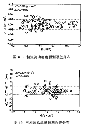 其中,系數(shù)C及D隨含氣率Kg的實(shí)驗(yàn)擬合關(guān)系如圖7及圖8所示。聯(lián)立式(10)、(11)及(12),采用迭代求解法就可以計(jì)算得到三相流流動(dòng)密度值。圖9為計(jì)算得到的流動(dòng)密度與模擬井實(shí)驗(yàn)標(biāo)定的流動(dòng)密度比較結(jié)果。可以看出,絕大部分實(shí)驗(yàn)點(diǎn)的流動(dòng)密度預(yù)測(cè)偏差落在-0.03與0.03誤差線之間(圖9中ρnn表示預(yù)測(cè)流動(dòng)密度,ρn為模擬井標(biāo)定流動(dòng)密度),其絕對(duì)平均誤差為AD=0.018g/cm³,絕對(duì)平均相對(duì)誤差為AAPD=3.6%,與圖2所示的實(shí)驗(yàn)關(guān)系相比,其三相流流動(dòng)密度的預(yù)測(cè)精度是令人滿意的。聯(lián)立方程(4)、(10)、(11)及(12)式,采用非線性方程組迭代解法就可以預(yù)測(cè)得到三相流總流量。圖10為預(yù)測(cè)總流量誤差結(jié)果,其絕對(duì)平均誤差為AD=2.639m³/d,絕對(duì)平均相對(duì)誤差為AAPD=5.8%,取得了較高精度的油氣水三相流總流量預(yù)測(cè)結(jié)果。