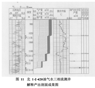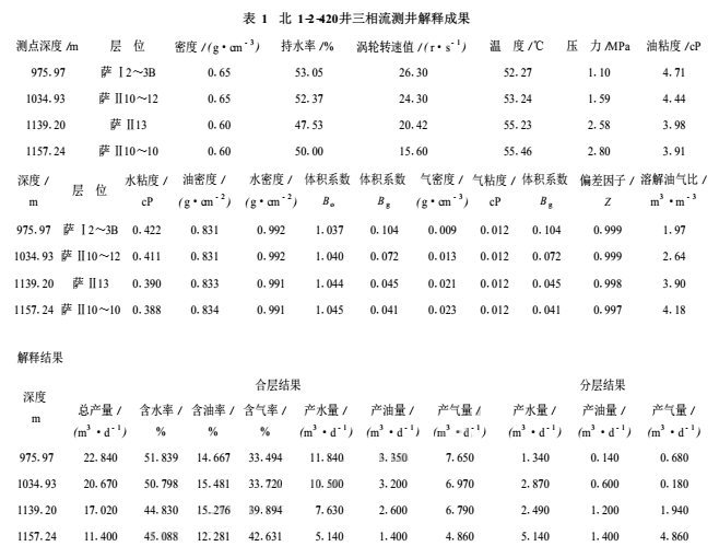 用本文提出的總流量預(yù)測(cè)模型共處理了8口含氣油井的三相流測(cè)井資料。圖11為北1-2-420井三相流測(cè)井資料處理實(shí)例,其解釋結(jié)果見表1。經(jīng)對(duì)8口含氣油井的實(shí)際處理效果表明,傘集流三相流測(cè)井組合儀可以較準(zhǔn)確地確定油井油氣水三相流產(chǎn)出剖面。