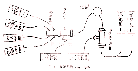 變送器II(卡箍式渦輪流量計(jì))安裝在水龍帶與水泥頭之間,信號(hào)送至二次儀表II,用以計(jì)量泥漿泵所替泥漿量
