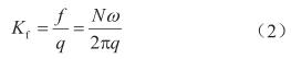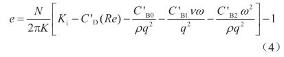 式中q表示體積流量,m3/s;ν表示介質(zhì)的運動黏度,m2/s;雷諾數(shù)Re=4q/(πdν);d表示流量計口徑,m;ρ表示介質(zhì)的密度,kg/m3;C'D、C'B0、C'B1和C'B2分別表示4個待定系數(shù),在某個流量點下標(biāo)定出的儀表系數(shù)(Kf,表示單位體積流體通過流量計時,流量計輸出的脈沖數(shù),1/m3)和轉(zhuǎn)子葉片頻率(f,s-1)的關(guān)系為: