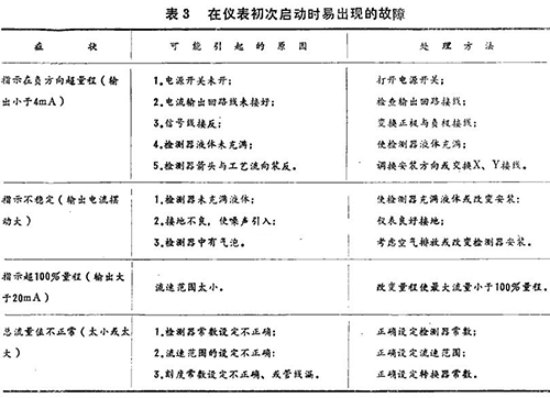 在儀表指示不正常時(shí),可根據(jù)下面介紹的一些典型故障和處理方法進(jìn)行必要的處理。這些故障可分為啟動(dòng)時(shí)易產(chǎn)生的故障,正常運(yùn)行時(shí)出現(xiàn)的故障和接地不良引起的故障(見(jiàn)表3、表4)。