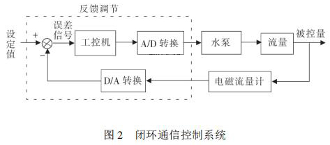 通信控制系統(tǒng)由工控機、變頻器、水泵、數(shù)據采集卡、消防水流量計等組成。在整個熱量表耐久性試驗裝置中,消防水流量計與被試驗熱量表串聯(lián)在試驗管路中。系統(tǒng)設定流量值 qs,通過工控機發(fā)送信號給變頻器,來控制水泵運轉,系統(tǒng)通過研華數(shù)據采集卡 PCI1711 將采集到的消防水流量計當前瞬時流量值反饋給工控機,工控機將返回流量值與設定流量值qs進行比較,從而確定是否需要重新調整變頻器頻率控制水泵轉速。此過程是一個完整的閉環(huán) PID 控制過程,其閉環(huán)控制過程如圖 2 所示。 2. 2 管路切換系統(tǒng)管路切換主要由冷熱水箱、水泵、開關閥等組成。要實現(xiàn)熱量表耐久性 4000 次冷熱沖擊試驗,需要實時控制管路中熱水與冷水的交替使用。