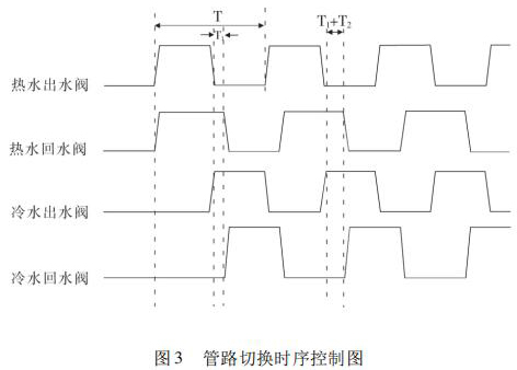 開始試驗,冷熱水箱預先達到試驗要求溫度,水泵運轉調節(jié)管路流量至設定值。系統(tǒng)給定信號控制四個開關閥(熱水出水閥、熱水回水閥、冷水出水閥、冷水回水閥) 的打開與關閉,實現(xiàn)冷熱水的切換。熱水沖擊時,熱水出水閥與熱水回水閥打開的同時,冷水出水閥與冷水回水閥關閉,確保試驗管路熱水沖擊;同理,冷水沖擊時,冷水出水閥與冷水回水閥打開,熱水出水閥與熱水回水閥關閉,確保試驗管路冷水沖擊。系統(tǒng)通過四個開關閥對管路進行時序控制,達到管路切換的目的,很好地實現(xiàn)了 4000次冷熱循環(huán)沖擊試驗。其具體的管路切換控制時序圖如圖 3 所示。