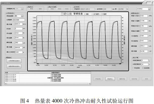 本文研究的 4000 次冷熱沖擊試驗的實現(xiàn)具有以下特點: (1)基于“工控機 +水泵 + 消防水流量計”的閉環(huán)控制系統(tǒng),實現(xiàn)了流量自動反饋調節(jié),滿足試驗要求; (2)通過四個開關閥的時序切換,自動控制試驗溫度,很好的完成了 4000 次溫度沖擊試驗; (3)通過“工控機 + 數(shù)據數(shù)據采集卡”的數(shù)據采集系統(tǒng),實時監(jiān)控試驗過程中的流量、溫度、壓力等相關參數(shù),實現(xiàn)試驗方式的自動控制,并能對試驗數(shù)據進行分析與評定。 (4)試驗的全過程為智能自動化,可無人員留守看護。試驗結果可直接反映出熱量表在長時間運行后的可靠性。為我國熱量表耐久性試驗研究提供檢測手段,為促進產品質量提升做好技術保障。