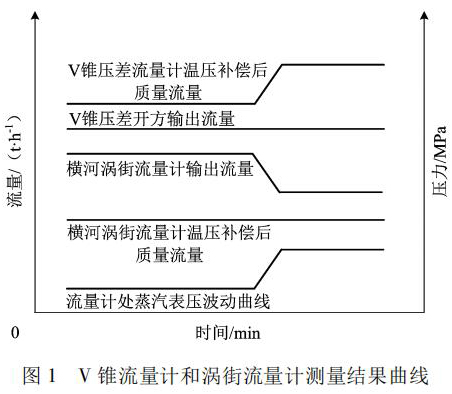 根據(jù)物料平衡反復(fù)研究,渦街流量計(jì)測量的質(zhì)量流量動(dòng)態(tài)曲線比較客觀反映了蒸汽流量的變化; 而 V 錐流量計(jì)測量的質(zhì)量流量偏大 5%。說明該差壓流量計(jì)元件沒能產(chǎn)生和實(shí)際流量變化對(duì)應(yīng)的差壓。