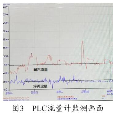 通過圖3可以看出,PLC 上輔汽測量用的氣體渦輪流量表的量程設(shè)置為30t/h,現(xiàn)場設(shè)備量程實際為5t/h,兩者嚴重不符,因此測量值8.286t/h 為錯誤值,需要對程序進行修改。