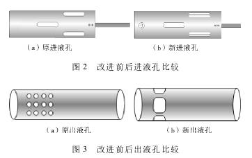防砂卡重油流量計(jì)量表結(jié)構(gòu)如圖1所示,主要由重油流量計(jì)量表、篩狀出液孔、重油流量計(jì)量表安裝短接、解卡管、解卡管開(kāi)槽、中心管、長(zhǎng)條孔(銷釘運(yùn)動(dòng)槽7)、薄壁筒、進(jìn)液孔、解卡管固定銷釘、含水傳感器安裝筒組成。采用等效面法,將進(jìn)液孔一分為二,改為寬2mm的矩形進(jìn)液孔,解決從進(jìn)液孔進(jìn)入的長(zhǎng)垢片或大垢片造成的砂卡,如圖2所示。將原先3個(gè)方型的出液孔改為直徑4mm的陣列狀的篩孔,解決儀器在下井過(guò)程中從出液孔進(jìn)入儀器的長(zhǎng)垢片、大垢片造成的砂卡,如圖3所示。