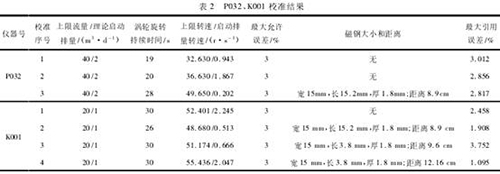 渦輪葉片能轉(zhuǎn)動(dòng)的持續(xù)時(shí)間是指渦輪調(diào)試好后,在一定作用力下,渦輪葉片從轉(zhuǎn)動(dòng)開(kāi)始到停止的時(shí)間。由表2可知,P032*1次校準(zhǔn)時(shí),解卡裝置末端沒(méi)有安裝磁鋼,渦輪調(diào)試結(jié)果持續(xù)時(shí)間19s,*大引用誤差3.012%不合格,啟動(dòng)排量2m3/d時(shí),平均轉(zhuǎn)速為0.943r/s,渦輪雖然沒(méi)有轉(zhuǎn)動(dòng),但已接近轉(zhuǎn)動(dòng)。P032*2次校準(zhǔn)時(shí),解卡裝置末端沒(méi)有安裝磁鋼,渦輪調(diào)試結(jié)果持續(xù)時(shí)間20s,*大引用誤差2.856%合格,啟動(dòng)排量2m3/d時(shí),渦輪轉(zhuǎn)動(dòng),平均轉(zhuǎn)速為1.867r/s。K001*1次校準(zhǔn)時(shí),解卡裝置末端沒(méi)有安裝磁鋼,渦輪調(diào)試結(jié)果持續(xù)時(shí)間30s,*大引用誤差2.458%合格,啟動(dòng)排量1m3/d時(shí),渦輪轉(zhuǎn)動(dòng),平均轉(zhuǎn).速為2.245r/s。P032和K001的校準(zhǔn)結(jié)果表明,在啟動(dòng)排量時(shí),渦輪葉片轉(zhuǎn)動(dòng)的持續(xù)時(shí)間超過(guò)20s,就可以保證啟動(dòng)排量、*大引用誤差合格。為了提高重油流量計(jì)量表校準(zhǔn)精度,硬性規(guī)定為了保證啟動(dòng)排量,渦輪葉片轉(zhuǎn)動(dòng)的持續(xù)時(shí)間為30s。