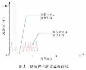 防砂卡重油流量計(jì)量表在五大隊(duì)成功解卡370井次,現(xiàn)場(chǎng)解卡測(cè)試曲線見(jiàn)圖5。剛測(cè)試時(shí),渦輪葉片轉(zhuǎn)動(dòng)正常,大約在20s左右,由于流體帶進(jìn)的雜質(zhì)導(dǎo)致流量曲線歸零。通過(guò)儀器二芯供電收傘,大約15s后再開(kāi)傘,一芯流量供電測(cè)試,渦輪葉片通過(guò)瞬間開(kāi)收傘,擴(kuò)大了葉輪與渦輪殼體之間的空間,雜質(zhì)通過(guò)渦輪葉片旋轉(zhuǎn)正常。從曲線可以看出,在解卡前和解卡后,渦輪旋轉(zhuǎn)--致,都為15m3/d左右,而且解卡前后沖次一致,重油流量計(jì)量表解卡裝置有效解決了因油井出砂、垢片、間隙小造成的砂卡,砂卡率由原先的70%降低到30%,實(shí)現(xiàn)了產(chǎn)液剖面流量準(zhǔn)確測(cè)試。