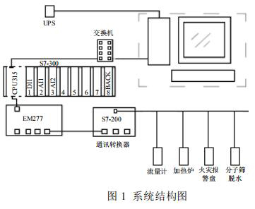 集氣站是收集氣井所生產天然氣的站場,在集氣站內對天然氣進行節(jié)流降壓、加熱、調壓計量等各種工藝預處理,設備眾多且分散。為方便進行檢測和操作,必須進行統(tǒng)一的數(shù)據(jù)采集,在監(jiān)控臺進行數(shù)據(jù)的管理。集氣站設備主要包括加熱爐、防凍液流量計、分子篩、火災報警盤,以及供電設備 UPS 等,這些不同廠家的設備基本都支持Modbus 協(xié)議,通過 Modbus 通訊可以將這些數(shù)據(jù)采集。為了有效降低成本,設計了如圖 1 所示的系統(tǒng)。系統(tǒng)采用西門子 S7-300 控制器,通過以太網(wǎng)連接上位機監(jiān)控軟件,再通過 MP277 連接S7-200 的方式。S7-200 控制器自帶 RS485 接口,能夠進行 Modbus 通訊,采集現(xiàn)場各種設備數(shù)據(jù)。*后通過以太網(wǎng)通訊將設備數(shù)據(jù)上傳至監(jiān)控軟件,方便操作人員進行監(jiān)控,該方案簡單有效,能夠實現(xiàn)集氣站內設備的狀態(tài)監(jiān)控,數(shù)據(jù)處理,有效的進行天然氣的生產工作。