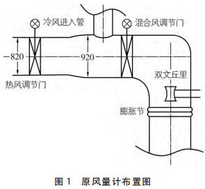 從流量測量角度講,影響流場的主要為熱風(fēng)調(diào)門、擴(kuò)管、彎頭以及一次冷風(fēng)的混入,閘板門和混合風(fēng)調(diào)門由于運(yùn)行時處于全開狀態(tài),影響可忽略,目前使用了單點(diǎn)雙文丘里管的測量方式,有以下問題: