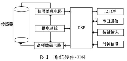 高頻勵(lì)磁自來水流量計(jì)由傳感器、高頻勵(lì)磁電路、信號處理電路等組成,其中高頻勵(lì)磁電路決定著傳感器磁場的強(qiáng)弱,勵(lì)磁電路的穩(wěn)定性以及精確性決定著系統(tǒng)檢測的準(zhǔn)確性以及穩(wěn)定性。DSP 系統(tǒng)控制勵(lì)磁電路激勵(lì)傳感器線圈,當(dāng)線圈中有導(dǎo)電液體流過時(shí),其切割磁感線并在傳感器兩端的線圈上產(chǎn)生感應(yīng)電動(dòng)勢,利用信號檢測電路監(jiān)測感應(yīng)電動(dòng)勢的大小,*后根據(jù)相應(yīng)關(guān)系計(jì)算出液體的流量,系統(tǒng)硬件框圖如圖 1 所示。