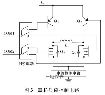 如圖2 所示,在對傳感器線圈進(jìn)行勵(lì)磁時(shí),通過比較器控制切換開關(guān)切換高低壓進(jìn)行勵(lì)磁。V ref 作為比較器的基準(zhǔn)輸入端,其表示勵(lì)磁電流的電壓穩(wěn)態(tài)值;而 C ur 則表示 H 橋勵(lì)磁電路中檢測到的電壓信號。一開始當(dāng)系統(tǒng)處于低壓勵(lì)磁狀態(tài)時(shí),系統(tǒng)會自動(dòng)斷開切換電路中的電流旁路,此時(shí)系統(tǒng)通過利用 H 橋向勵(lì)磁線圈提供恒定電流。當(dāng)勵(lì)磁方向變化時(shí),電流檢測電路就會檢測到電流變?yōu)樨?fù)方向,比較器的 C ur 端與V ref 端的平衡就會發(fā)生變化,此時(shí)系統(tǒng)通過比較器自動(dòng)切換為高壓勵(lì)磁狀態(tài)。與低壓勵(lì)磁方式相反,在此種狀態(tài)下,恒流控制電路關(guān)閉而電流旁路打開,線圈中的能量就會存儲在能量回饋電路中,此時(shí) C 1 端的電壓會超過高壓源。等勵(lì)磁線圈中的能量釋放完后,電流逐漸降為零,此時(shí)能量回饋電路就會利用電流旁路和 H 橋?qū)⒛芰糠答伣o勵(lì)磁線圈。當(dāng)電容 C 1 端的電壓下降到小于高壓源時(shí),系統(tǒng)就會自動(dòng)通過電流旁路和H 橋直接對勵(lì)磁線圈進(jìn)行勵(lì)磁,當(dāng)勵(lì)磁線圈中的電流超過設(shè)定閾值時(shí),C ur 端電壓就會大于 V ref 點(diǎn)電壓,此時(shí)比較器又會切換成低壓勵(lì)磁方式,如此反復(fù)循環(huán)控制,達(dá)到對勵(lì)磁線圈恒流控制的目的。圖 3 為 H 橋勵(lì)磁控制電路。