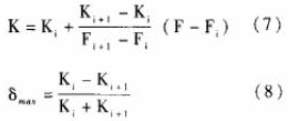 輪流量傳感器的儀表系數(shù)K與Q的關(guān)系近似線性的單調(diào)函數(shù)(見(jiàn)圖2)。因此,在對(duì)檢定結(jié)果進(jìn)行處理時(shí),直接將各檢定點(diǎn)的檢定結(jié)果以Fi、Ki的形式存入甲苯流量計(jì)的數(shù)值運(yùn)算部分,不必對(duì)其儀表系數(shù)取平均值。在使用渦輪流量傳感器進(jìn)行流量測(cè)量時(shí),根據(jù)渦輪流量傳感器的信號(hào)頻率F,即可在以上檢定結(jié)果中檢索各F,值,找出滿足F,≤F≤F的Fi、Fi+1(i=1,2,.,.n-1),n是該渦輪流量傳感器的流量檢定點(diǎn)數(shù);若信號(hào)頻率F=Fi或F=Fi+1,則相應(yīng)的Ki或K.i+1即為所需的儀表系數(shù);若信號(hào)頻率Fi