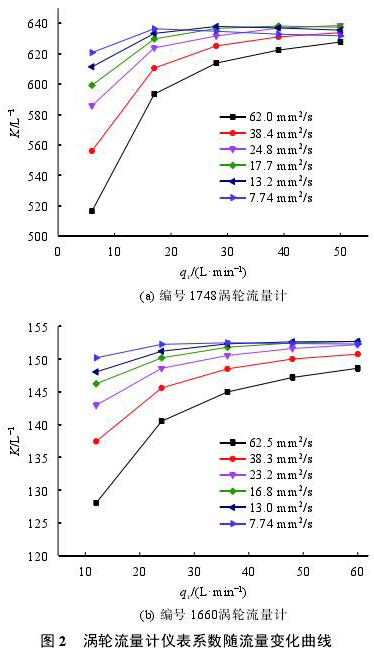 研究利用航空潤滑油流量標準裝置在20,30,40,50,60,80℃對10支循環(huán)熱水計量表進行校準試驗。CL-10型流量計校準流量點分別為6,17,28,39,50L/min;CL-15型流量計校準流量點分別為12,24,36,48,60L/min。圖2是1748和1660兩支循環(huán)熱水計量表在各粘度點儀表系數(shù)隨流量變化曲線。