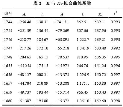 圖5是1744和1655兩支循環(huán)熱水計量表Re與K擬合曲線圖。表2是流量計擬合曲線系數(shù)。通過r2值對擬合度進行評估,10支循環(huán)熱水計量表擬合優(yōu)度值處于0.992~0.998之間,擬合結(jié)果非常好。