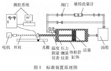 燃油動(dòng)態(tài)流量標(biāo)準(zhǔn)裝置的工作原理為:工作過(guò)程中電機(jī)旋轉(zhuǎn),驅(qū)動(dòng)滾珠絲杠帶動(dòng)標(biāo)準(zhǔn)體積管活塞左行,排出液體流經(jīng)控制閥門(mén)及被檢流量計(jì)后,經(jīng)過(guò)過(guò)濾器回到儲(chǔ)油箱;同時(shí),儲(chǔ)油箱里的油經(jīng)過(guò)下游管段進(jìn)入標(biāo)準(zhǔn)體積管。