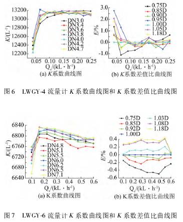 圖3~圖8分別為流量計(jì)的K系數(shù)曲線圖和無(wú)量綱化后的差值比曲線圖。