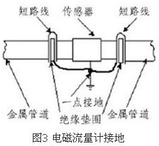 (4)盡量避開振動源、磁源(大功率電機、變壓器)由于樹脂計量表的測量感應電壓很小,電壓較低,易受外界電磁噪聲的影響,故在安裝時應進行可靠的接地連(跨)接。金屬管道樹脂計量表接地連(跨)接方法如圖3所示