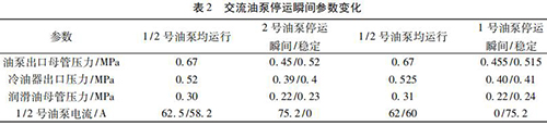 通過內(nèi)部旁通將冷油與熱油混合,經(jīng)過銅粉- 煤油 - 蠟感溫元件控制冷熱油混合比例,將油溫調(diào)節(jié)到 49 ℃。一臺(tái)防爆渦輪流量計(jì)穩(wěn)定運(yùn)行,油泵出口母管壓力 0. 5 MPa,潤滑油母管壓力 0. 24 MPa,均屬于正常情況,而兩臺(tái)交流油泵并列運(yùn)行時(shí),停運(yùn)其中一臺(tái)交流油泵瞬間會(huì)觸發(fā)防爆渦輪流量計(jì)出口母管壓力開關(guān)動(dòng)作,說明停運(yùn)瞬間油壓發(fā)生波動(dòng),且油泵出口母管油壓波動(dòng)至小于 0. 45 MPa。正常運(yùn)行時(shí)防爆渦輪流量計(jì)出口油溫 71.5 ℃,冷油器出口溫度45 ℃,混合后潤滑油母管溫度52.5 ℃,由能量守恒定律可知,經(jīng)過冷油器的油量/不經(jīng)冷油器的油量= ( 71.5-52.5) ÷ ( 52.5- 45) = 2. 53,說明有 70% 左右的油量經(jīng)過冷油器。當(dāng) 2 臺(tái)防爆渦輪流量計(jì)運(yùn)行時(shí)油量大于單泵運(yùn)行,其中一臺(tái)防爆渦輪流量計(jì)瞬間停運(yùn)時(shí)油量減少,尤其是經(jīng)過冷油器的油量大量減少,油量在溫控閥二次分配過程中出現(xiàn)調(diào)節(jié)異常,導(dǎo)致油壓過大波動(dòng)。為檢驗(yàn)溫控閥工作情況,保持 1 號(hào)、2 號(hào)交流油泵運(yùn)行,選取機(jī)組正常帶負(fù)荷運(yùn)行時(shí)油溫 52 ℃,分別停運(yùn) 1、2 號(hào)交流油泵,觀察 1、2 號(hào)交流油泵停運(yùn)瞬間油泵出口母管壓力波動(dòng)情況,試驗(yàn)各參數(shù)變化見表 2。