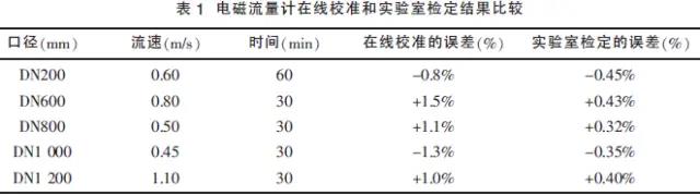 近幾年來,通過一系列的現(xiàn)場試驗(yàn),利用上述方法對液體流量計進(jìn)行在線的校準(zhǔn),取得了比較可信的結(jié)果。表1顯示了對不同口徑規(guī)格的電磁流量計進(jìn)行在線校準(zhǔn)的示值誤差結(jié)果和實(shí)驗(yàn)室標(biāo)準(zhǔn)裝置上檢定結(jié)果的比較情況: