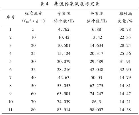 利用現(xiàn)有的 LJ - IB 型流量標(biāo)定裝置,將阻抗找水儀分別放入集流模擬井和套管模擬井中,對(duì)dn50液體渦輪流量計(jì)進(jìn)行全集流和傘集流流量檢測(cè),前后兩次測(cè)量結(jié)果進(jìn)行比較,計(jì)算集流器的漏失量,試驗(yàn)數(shù)據(jù)見(jiàn)表 4。