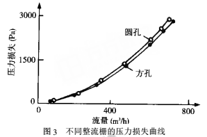 圖3是只改變整流柵條件下,流體經(jīng)過流量計的壓力損失曲線。由圖知,盡管方孔整流柵比圓孔增大了萬方數(shù)據(jù)的通流面積,但對流體壓損的影響并不明顯。在小于300m³/h的范圍內(nèi),兩者幾乎沒有差別,在Q=700m³/h處,方孔整流柵*大使壓損降低300Pa,比圓孔整流柵改善約10%,在工作范圍60~600m³/h內(nèi),方孔比圓孔平均改進約2%,但方孔加工難度大于圓孔,因此,應(yīng)根據(jù)實際情況選擇整流柵。