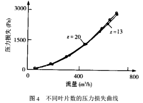 本文在允許范圍內(nèi)分別選擇13和20個葉片數(shù)的葉輪進行了測量,結(jié)果如圖4所示??煽吹剑瑑蓷l曲線幾乎重合。說明在允許范圍內(nèi),葉輪葉片數(shù)的增減對壓力損失的影響可以忽略。但采用13葉片數(shù)的葉輪時,測得流量計起始流量為6.5m³/h,而采用20葉片數(shù)的葉輪,其起始流量為5.5m³/h,適當(dāng)增加葉片數(shù),可以較明顯地提高流量計的靈敏度。值得注意的是,增加葉片數(shù)會使重疊度增大,過大的重疊度將使流量計性能惡化。