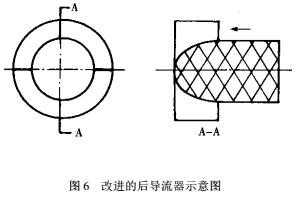 作者在半開式基礎(chǔ)上設(shè)計加工了另一種改進的后導(dǎo)流器:把半開式葉片部分縮短一半,同時將葉片數(shù)減少為4,在原無葉段增加與有葉段數(shù)目相同位置均勻相錯的葉片,但不加外筒。目的是盡量在不增加摩擦和阻塞損失情況下,加強對經(jīng)過葉輪后旋轉(zhuǎn)流體的整直作用。如圖6所示。