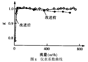 由圖8可看出,采用改進的后導(dǎo)流器后,流量計儀表系數(shù)比改進前有較好的改善,在量程范圍內(nèi)(60~600m³/h),K很好地體現(xiàn)了系數(shù)的特性,甚至在超過*大量程后,能繼續(xù)保持水平直線狀態(tài)。改進前的流量計K值也較好,但隨著流量增大,直線略向下傾斜,偏離了水平位置。