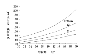 (2)可見,對確定的渦輪流量傳感器,易知口徑D大,K。值小;葉片數(shù)n大,K。值大等。如果要獲得較大的儀表常數(shù),就一要對渦輪傳感器的結(jié)構(gòu)參數(shù)進行優(yōu)化設計,從圖(2)可以看出,葉片高度h增加,K。增大;導程角增大,K。增大。對于φ19的過環(huán)空大排量渦輪流量計而言,由上式計算得K。=74.567rpm/m³/d,而水中標定的Kw=78.89rpm/m³/d,表1給出不同口徑和不同導程角下渦輪流量計固有儀表常數(shù)的計算值。