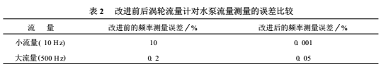 采用測頻計數(shù)——測周計脈沖法與目前測頻計數(shù)法相比,前者遠(yuǎn)遠(yuǎn)小于后者的測量誤差,采用這種方法不僅測量精度有保證,且可靠易于實現(xiàn),可從根本上解決渦輪流量計對水泵流量的測量精度及減小誤差問題。表2是改進(jìn)前后的測量誤差實測對比。