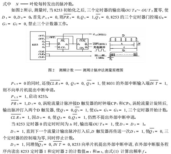 目前, 水泵流量的測量方法很多, 其中渦輪流量計使用方便, 價格適宜, 使用甚廣。利用其優(yōu)點, 采用測頻計數(shù)——測周計脈沖法, 可有效地控制誤差, 提高測試精度。