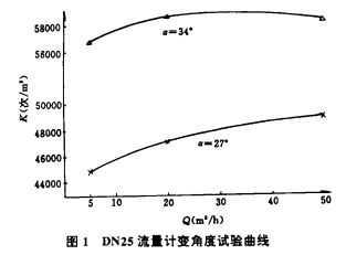 對(duì)DN25流量計(jì)分別做了葉片安裝角a為27°和34°的變角度試驗(yàn),其結(jié)果見表1和圖1。