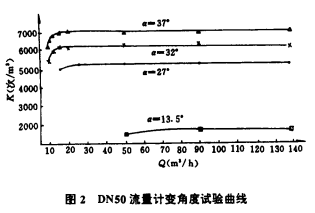 對(duì)DN50流量計(jì)分別做了a為13.5°、27°、32°和37°變角度試驗(yàn),其結(jié)果見表2和圖2。