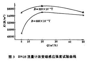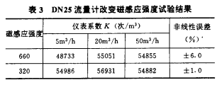 位于流量計(jì)之上,緊貼殼體處安裝著磁電轉(zhuǎn)換器,它將對(duì)渦輪葉片(由鐵磁性材料制成)產(chǎn)生一個(gè)恒定的磁性阻力矩。無論葉片處在靜止或轉(zhuǎn)動(dòng)過程中都將始終受到這一磁力作用。這一磁力將直接影響著流量計(jì)的性能,尤其小流量時(shí)影響更大。為了研究該磁力對(duì)流量計(jì)性能的影響情況,我們選取適當(dāng)?shù)拇鸥袘?yīng)強(qiáng)度,對(duì)同一臺(tái)DN25流量計(jì)進(jìn)行了變磁感應(yīng)強(qiáng)度B的影響試驗(yàn),其試驗(yàn)結(jié)果見表3和圖3。