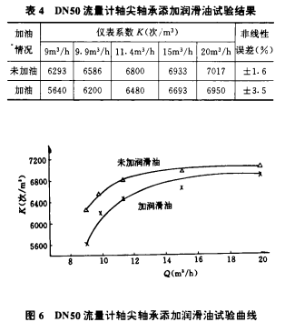 通常,流量計(jì)在出廠標(biāo)定前都在軸尖和軸承處加入少量的潤滑油,以防軸尖和軸承磨損過快。但是,由于潤滑油具有一定的粘性,它將影響流量計(jì)的性能,故我們對(duì)同一臺(tái)流量計(jì)做了不加潤滑油和加潤滑油的試驗(yàn),其試驗(yàn)結(jié)果見表4和圖6.