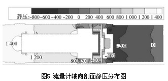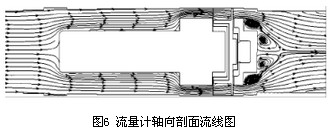 以流量Q=250m3/h的數(shù)值模擬計(jì)算結(jié)果為例進(jìn)行渦輪流量計(jì)內(nèi)部流場及壓力場的分析,圖5為渦輪流量計(jì)軸向剖面靜壓分布圖,前導(dǎo)流器前后的壓力場分布較均勻且壓力梯度較小,在機(jī)芯殼體與葉輪支座連接凸臺(tái)處壓力有所增加,連接面后壓力又逐漸減小,故認(rèn)為流體流經(jīng)葉輪支座產(chǎn)生壓力損失的主要原因是連接處存在凸臺(tái),導(dǎo)致流場出現(xiàn)較大變化,不能平滑過渡,建議將葉輪支座與機(jī)芯殼體的連接改為圓弧線型或流線型。觀察圖5和圖6,當(dāng)流體流經(jīng)葉輪從后導(dǎo)流器流出渦輪流量計(jì)時(shí),壓力梯度變化明顯,存在負(fù)壓區(qū)域并造成很大的壓降,在后導(dǎo)流器凸臺(tái)及流量計(jì)出口處速度變化明顯,由于氣流通過后導(dǎo)流器后流道突擴(kuò),在后導(dǎo)流器背面形成明顯的低速渦區(qū),產(chǎn)生了漩渦二次流。