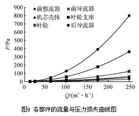 流量計(jì)各部件的壓力損失隨流量變化的趨勢與流量計(jì)總壓力損失隨流量的變化趨勢相同,其擬合公式為系數(shù)不同的二次多項(xiàng)式。各部件的壓力損失與流量呈二次函數(shù)關(guān)系,隨著流量的增加,壓力損失顯著增加。