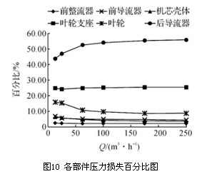 觀察圖10各部件壓力損失百分比圖,可見前整流器、前導(dǎo)流器和機(jī)芯殼體處的壓力損失很小,葉輪支座處壓力損失約占總壓力損失的1/4。前整流器所占?jí)毫p失比例在各流量點(diǎn)基本保持不變,前導(dǎo)流器和機(jī)芯殼體處的壓力損失隨流量的增加其比例略有降低,葉輪支座處壓力損失隨流量的增加其比例略有增加,但總體上受流量影響不大。葉輪處的壓力損失隨流量從13m3/h增加至250m3/h,其比例從15.88%降至8.71%,降幅明顯,后導(dǎo)流器處的壓力損失占總壓力損失的大半,隨著流量從13m3/h增加至250m3/h其壓力損失比例由43.77%升至55.83%,增幅明顯??傊髮?dǎo)流器、葉輪支座和葉輪是流體流經(jīng)渦輪流量計(jì)產(chǎn)生壓力損失的主要影響部件,可通過優(yōu)化其結(jié)構(gòu)以降低渦輪流量計(jì)的總壓力損失。
