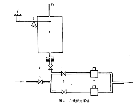 在生產(chǎn)系統(tǒng)或?qū)嶒炏到y(tǒng)上附設(shè)流量標(biāo)定裝置,在不影響生產(chǎn)或?qū)嶒灩ぷ髑闆r下進行標(biāo)定稱為在線標(biāo)定。若每次對流量進行檢測時都**進行標(biāo)定即為實時標(biāo)定或稱實時校準(zhǔn),實時標(biāo)定可以消除各種參數(shù)的變化對測量精度的影響。圖3為質(zhì)量法在線標(biāo)定系統(tǒng),它附設(shè)在工作系統(tǒng)中,可以進行實時標(biāo)定。處于工作情況時,打開開關(guān)4、5、6,,油液通過渦輪流量計7去工作系統(tǒng),同時通過開關(guān)5充往計量油箱1,計量油箱與液體管道無剛性連接,全部質(zhì)量通過杠桿2作用在力傳感器3上,計量油箱充一定的油液后在傳感器輸出信號控制下關(guān)閉開關(guān)5,作好標(biāo)定準(zhǔn)備。標(biāo)定時,打開開關(guān)5,關(guān)閉開關(guān)4,此時計量油箱中的油液在計量油箱上方提供的一定氣壓P1驅(qū)動下經(jīng)過被標(biāo)定流量計進人工作系統(tǒng)。此時只需測出力傳感器測出的起始質(zhì)量M1到終了質(zhì)量M2之間的時間就可得到質(zhì)量流量,達到終了質(zhì)量M2后,自動打開開關(guān)4,恢復(fù)正常工作狀態(tài),該系統(tǒng)在計算機控制下很容易實現(xiàn),并立即求出實時的儀表常數(shù),計算機每次采集流量數(shù)據(jù)之前按上述過程進行一次實時標(biāo)定。然后進行數(shù)據(jù)采集,按實時標(biāo)定的儀表常數(shù)進行數(shù)據(jù)處理。
